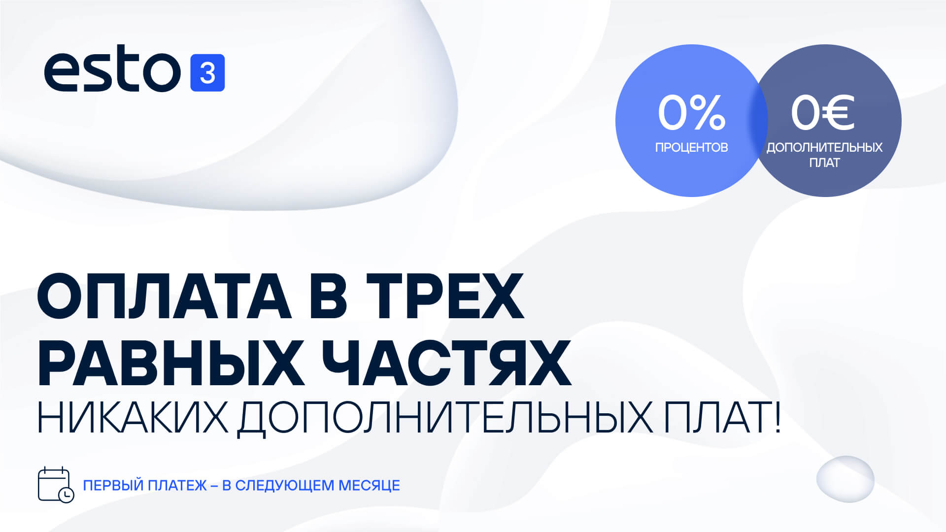 Выбрав ESTO 3 в качестве способа оплаты, вы можете разделить общую сумму покупки на 3 равные части для оплаты в течение 3 месяцев, без дополнительных плат.